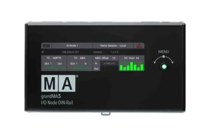 The MA Lighting MA4023578 Grandma3 I/O Node DIN-Rail is the multi-tool of signal distribution within a grandMA3 lighting control system, especially for fixed installations. Wherever the signal is generated or needed just place a grandMA3 I/O Node DIN-Rail there and receive or send external signals. The grandMA3 I/O Node DIN-Rail comes in the same housing as a grandMA3 xPort Node DIN-Rail. The display shows the status of all input and output signals. Just add the grandMA3 I/O Node DIN-Rail as a Session Member and it is ready to go.