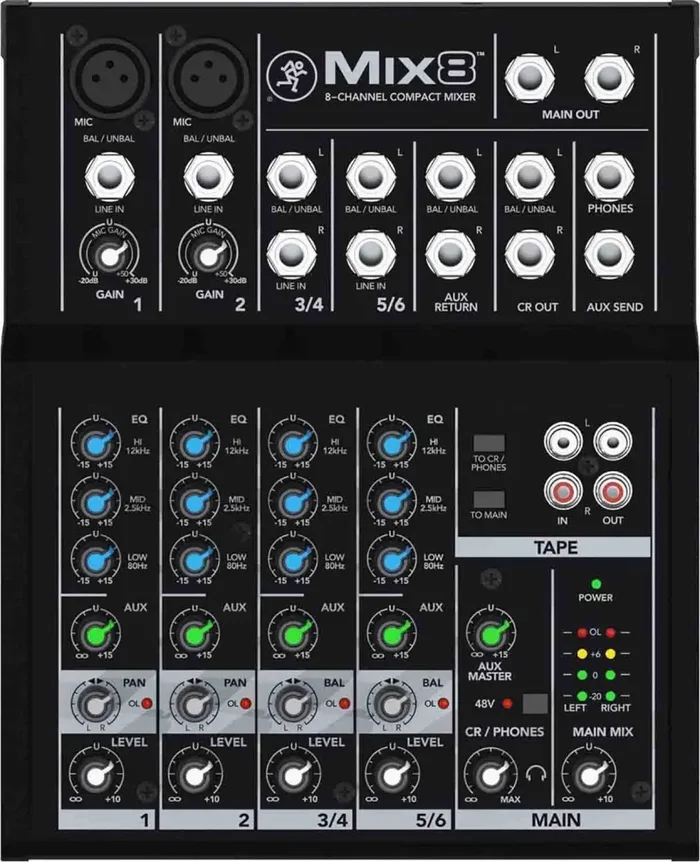 The Mackie Mix8 delivers the quality you expect from the world leader in compact mixer design. The professional and affordable Mix Series mixers feature high quality components, a rugged metal chassis and features designed for a variety of applications. With Mackie preamps and proven high-headroom, low-noise design, Mix delivers great sound from any source.