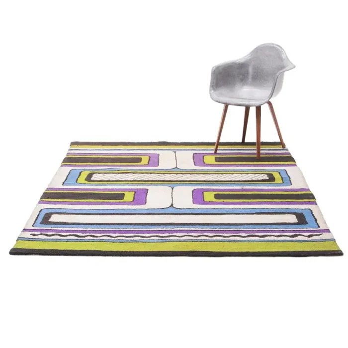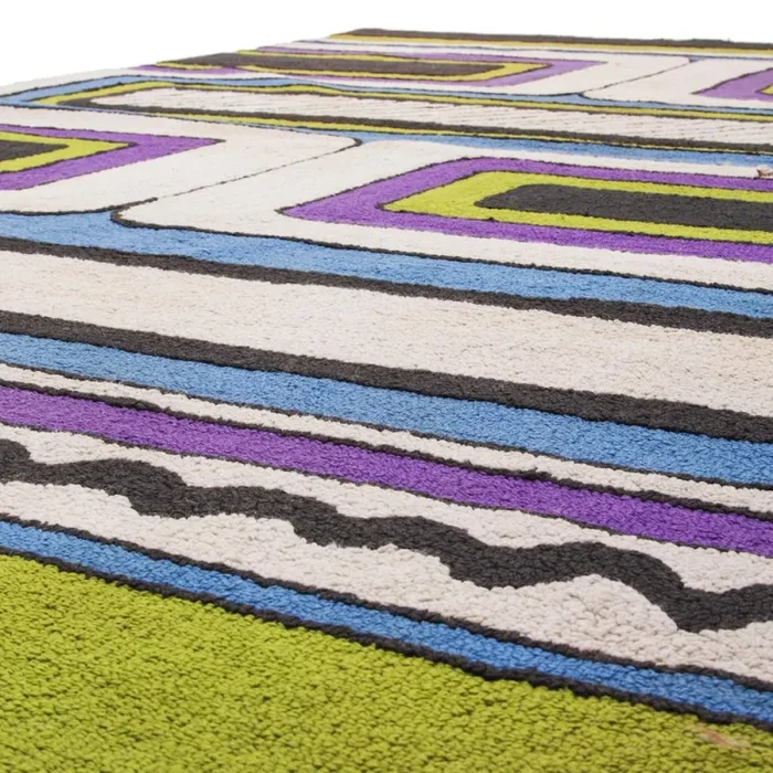 Details: Multicolor Maze Rug With Green, Purple and Blue Lines, Squares and Squiggles.