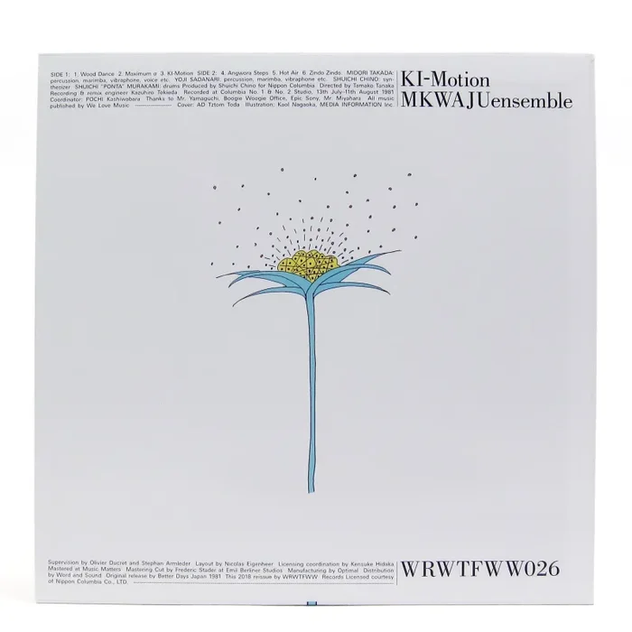 Before Through The Looking Glass, there was Ki-Motion. Two years before Midori Takada recorded her now famous 1983 solo album, the Japanese percussionist had already planted the seeds for her unique brand of ambient percussion fusion with Mkwaju Ensemble. On their debut album from 1981, Takada leads the ensemble through a suite of varied, transcendental sounds, all rooted in the concept that “rhythms represents the fabric of life.” Here Takada combines her brilliant marimba, vibraphone, and bamboo percussion playing, with synthesizer by Shuichi Chino, and additional drums and percussion by Shuichi Murakami and Yoji Sadanari, resulting in a timeless and otherworldly vibe. From the synthesizer-backed poly-rhythms of “Wood Dance,” to the ghostly atmosphere of “Maximum a,” the playful and eclectic title track “Ki-Motion,” or the gorgeous ambient drone “Hot Air,” Ki-Motion perfectly captures the spirit of the golden age of Japanese ambient music. Original pressings are exceedingly rare and prohibitively expensive (upwards of $400), so this timely WRWTFWWR reissue is more than welcome. Highly Recommended.