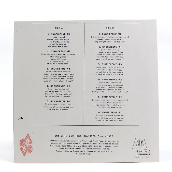 Beautiful interpretations of Erik Satie from veteran composer Morgan Fisher. Inside Satie was originally released in 1985 and found Fisher, who was based in Japan at the time (working with the likes of Yoko Ono, Haroumi Hosono and Dip In The Pool), improvising several Satie favorites on piano, melodica, and synthesizer with generous dollops of tape reverb. The result is delightfully free and pure, and a very worthy tribute to the work of Satie. From Fisher himself – “Inside Satie is one of the first albums I recorded in Japan shortly after moving here in 1985. In three days I improvised on several of my favourite Satie themes. Mostly I played piano as well as the rich, analog-sounding Yamaha GS-1 (precursor of the DX-7), and sometimes used long tape delays to build layers of sound. All the pieces were recorded in single takes – no overdubs (no time!).” This is the first ever vinyl reissue from Sacred Summits, complete with beautiful new silk-screened cover art. Recommended.