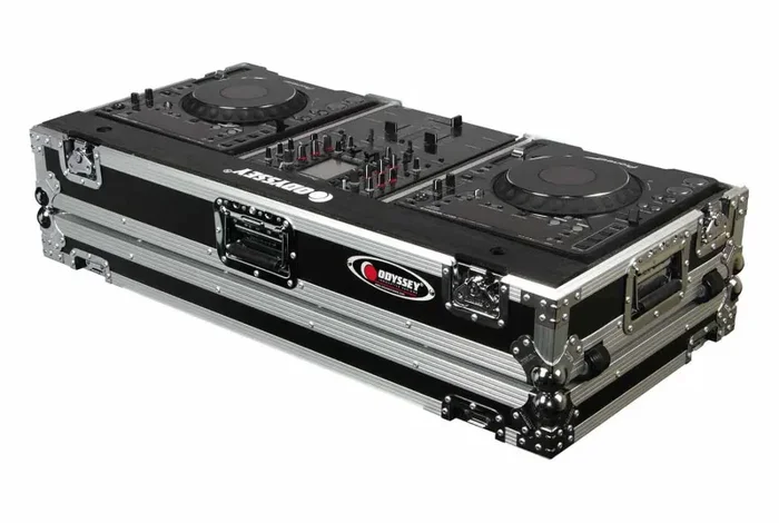 Odyssey FR10CDJWE Universal 10 Format DJ Mixer and Two Large Format Media Players Coffin Case. Our CD/digital media player DJ Coffins hold two large format tabletop CD/media players and one mixer. These ATA rolling coffins feature rugged built-in wheels, heavy-duty latches and spring-loaded handles, steel ball corners, and removable front access panels. Cabling is clean and easy through convenient access ports throughout.