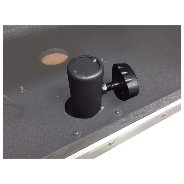 Before mounting at the bottom of your photo booth cabinet or other hollow structure remove the tension knob. After mounting reattach the tension knob and when ready and set at the desired position, twist and tighten to hold in place.