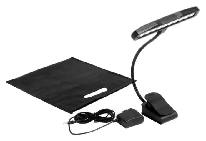 The On Stage LED510 Clip-On LED Orchestra Light features a wide lamp head that illuminates four side-by-side pages of sheet music. Supported by a gooseneck that facilitates precise positioning, the lamp can switch between two levels of brightness to accommodate a variety of lighting requirements. To preserve stage optics, the lampshade blocks light from reaching the audience. The versatile base either clips to a music stand or rests upright on a flat surface.