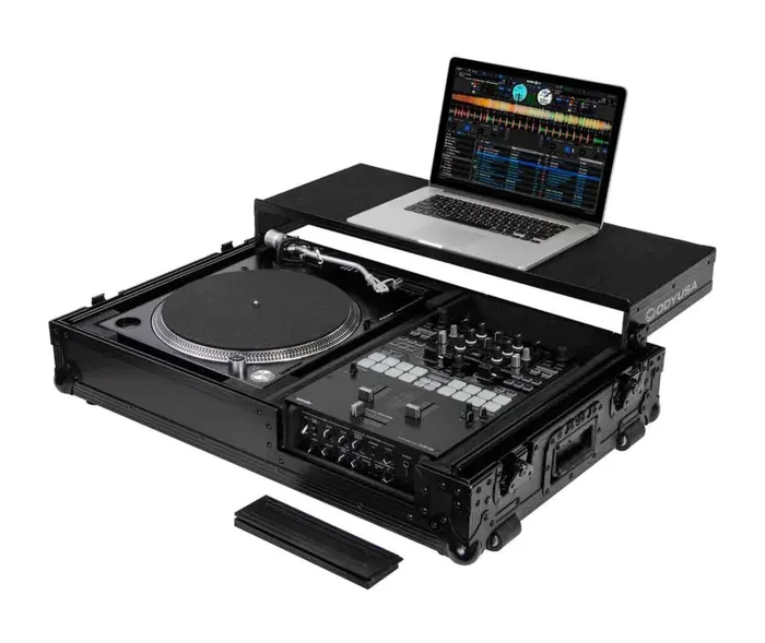 Case Features: Accommodates 10″ Format DJ Mixers, Cable Port Hole, Glide Platform Latch, Laptop Platform (Glide Style), Low Profile, Rubber Feet