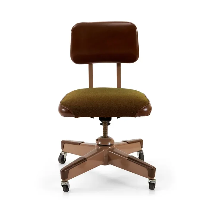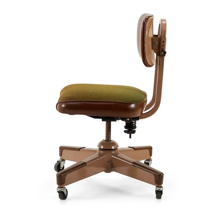 Details: Metal rolling office chair with olive green seat and brown leather back