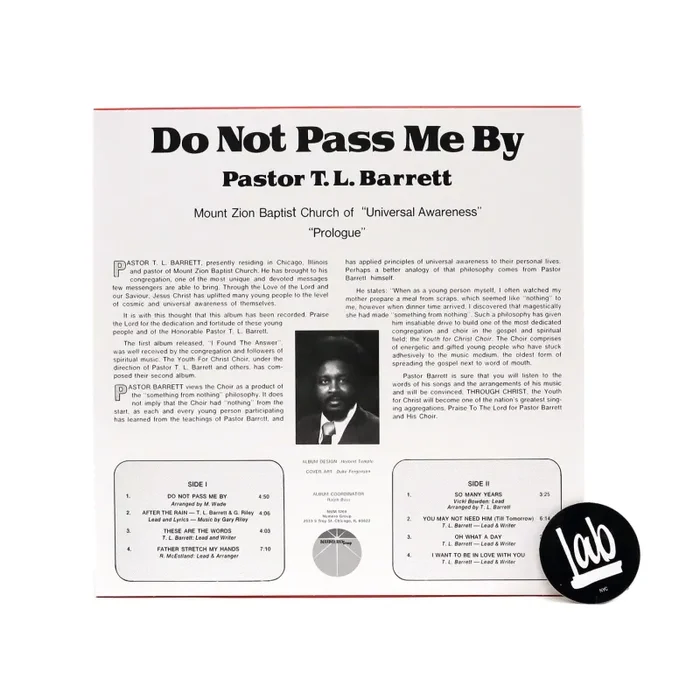 “The final album in Pastor T.L. Barrett’s 1970s four-part suite of gospel funk LPs, Do Not Pass Me By finds the fiery preacher getting spaced out on God’s love. Accompanied by his Youth For Christ Choir, the eight-song record is buoyed by the seven-minute opus ‘Father Stretch My Hands,’ later sampled by Kanye West on 2016’s The Life of Pablo.” – Numero Group