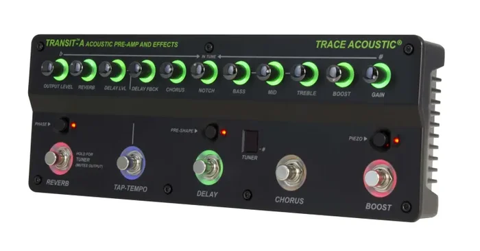 The Peavey Trace Elliot Transit A preamp pedal includes the right features for a professional acoustic guitar player without over burdening the user with extra controls that hinder quick and easy tweaking. The built in Compression, Notch Filter, Pre-shape and simple EQ controls ensure great basic tone, while the user-definable Boost, Chorus, Delay and Reverb offer all the tools necessary for artistic expression. The back-lit control panel becomes the chromatic tuner for accurate tuning. Built-in Pre and Post XLR balanced output, dry output and headphone output give the user the ins and outs they need for the best live coverage.