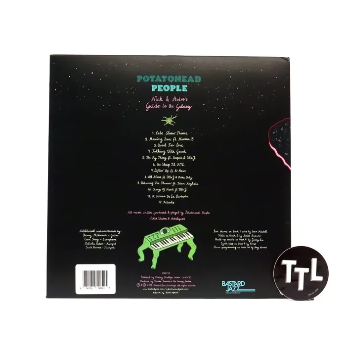 “Finally, a re-issue of Potatohead People’s bonafide classic second album Nick & Astro’s Guide to the Galaxy – and on black & red splatter to boot. Comprised of Vancouver producers and multi-instrumentalists Nick Wisdom and Astrological, Canadian duo Potatohead People boast a number of noteworthy accolades thanks to a their signature sound drawing influences from 90’s boom-bap, future soul, classic jazz, deep house and boogie/funk. Beginning with a series of EP’s, including their landmark ‘Kosmichemusik’ EP, Potatohead People’s productions quickly made their way to artists like Illa J who tapped the duo to produce his now critically acclaimed self-titled album, as well as producers like Kaytranada (who co-produced Illa J’s ‘Strippers’ with the pair). Supporters such as Soulection, Nightmares on Wax, De La Soul, Pomo, DJ Spinna, Big Boi, and Phife Dawg have also played formidable roles in championing the sound of Potatohead People worldwide.” – Bastard Jazz