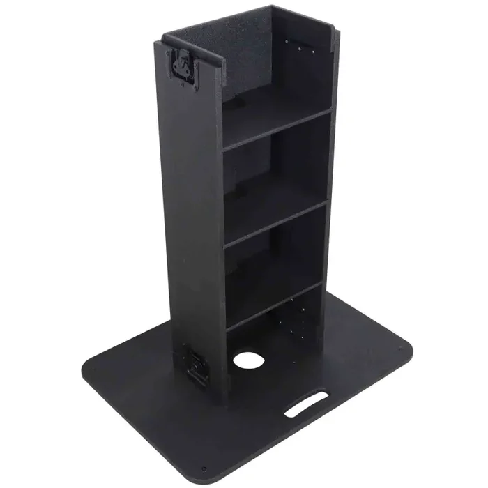 Out of the box, assembly takes minutes with no tools required. Simply snap-lock the base plate to the center shaft together with the steel butterfly latch locks. Once the center column and shelves are installed, mount the top control deck to the top of the column, and then secure it with the latches. Included in the box are 4 custom cut foam inserts and top frames to use with your desired DJ controller. Once the controller has been placed inside, apply the frame and now you can mount your boom arm and laptop tray to the left or right position.