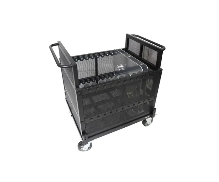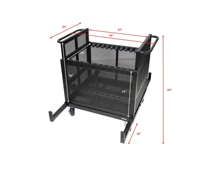 The ProX X-BP8X30-10X24MK2 Dolly Cart is a heavy-duty solution designed to store and transport base plates, truss, stage legs, cables, and other accessories with ease. Built from durable steel and coated with a sleek black powder finish, this cart ensures long-lasting performance. With specialized racks, it allows for vertical stacking of up to eight 30-inch or ten 24-inch base plates. However, it is not compatible with a mixed load of different sizes. The dolly features four telescoping brackets for secure truss transport, and its four industrial-grade swivel wheels, two of which have brakes, enhance maneuverability. Please note that base plates and truss are not included.