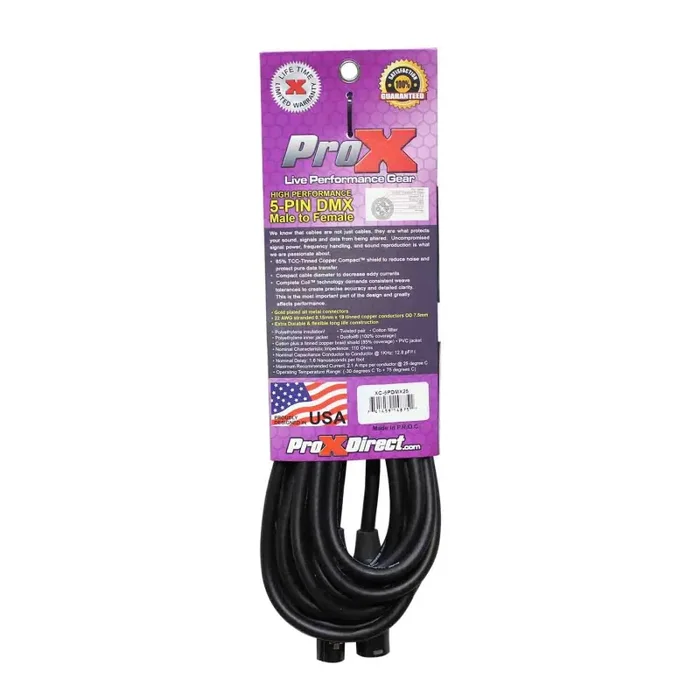The ProX XC-5PDMX25 cable is ideal for DMX connection applications where a device with a male DMX XLR-5 output/input needs to be connected to a device with a female DMX XLR-5 output/input. 22AWG Oxygen-Free Copper (OFC) conductors for maximum signal transfer.