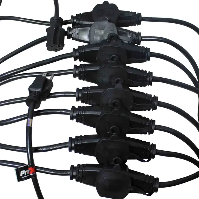 The ProX XC-MEP12-529 is a 12/3AWG 120VAC Male to 9 Female Socket Outlets Black Power-Extension Cord with Covers 52 Feet. This ProX XC-MEP12 120 VAC NEMA 15 Male to 9 Socket Female Extension/Power Cord provides uncompromised signal power and frequency handling high-performance 12/3 AWG. Bending and Twisting are no match for our high-performance tour-grade power cables. They’re designed to provide years of dependable power production and outlast every other cable on the market.