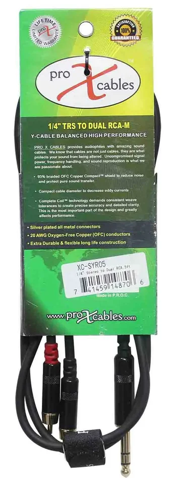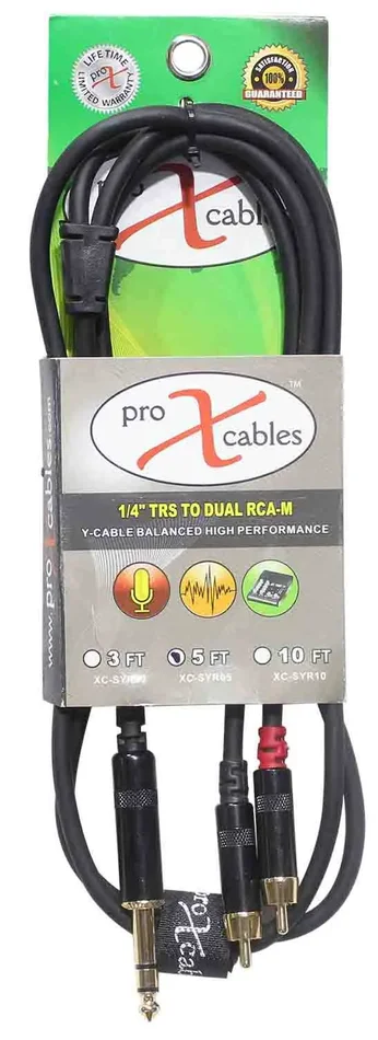 The Prox XC-SYR05 is an Unbalanced 1/4″ TRS-M to Dual RCA-M High-Performance Audio Cable – 5 Feet is ideal for professional touring and live sound applications where a device with a dual RCA output/input needs to be connected to a device with a 1/4″ TRS Stereo output/input. ProX cables are built with uncompromised quality with excellent performance at each connection – Instrument cables, Speaker cables, RCA cables, DMX cables, Power cables, and more. Our cables are made for professionals, by professionals.