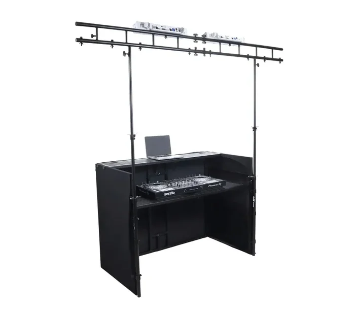 The ProX MESA MEDIA TRUSS PKG DJ TV Façade Workstation and Truss gives you an elegant professional look. With its strong and lightweight 4-sided folding aluminum frame with black finish PLUS integrating our XT-SSTM3260 Universal TV/Monitor Mount on the front. This media added DJ booth Is all you need for an exceptional DJ station. The setup of the system is easy and takes less than 10 minutes even with mounting the LED TV/Monitor. You can transform your DJ setup and expand your professional image with a video screen. The XF-MESA MEDIA has an additional top shelf and the table workspace is adjustable to three different positions. Two cable pass-throughs on both the top shelf and tabletop. Come with the XF-MESATRUSS to add lighting and accessories for mobile setup.