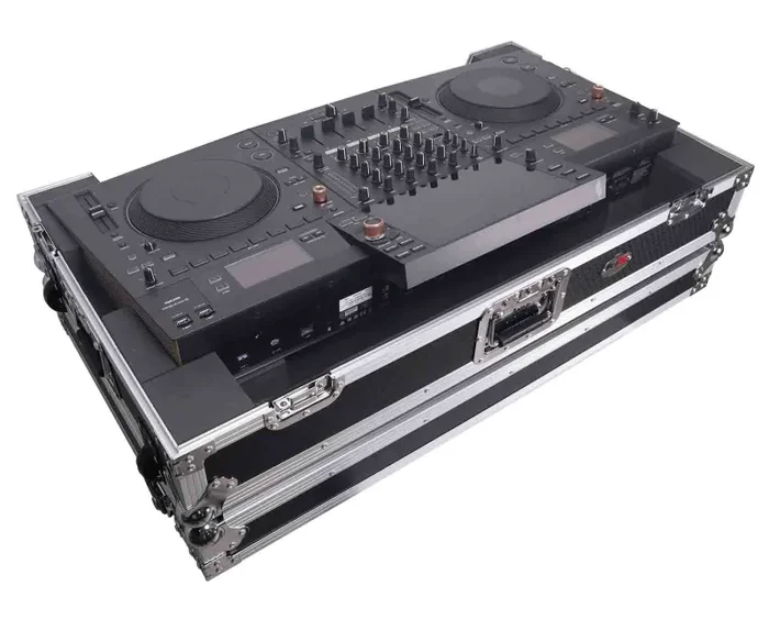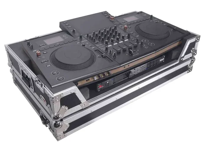 ProX Gig-Ready Series cases are constructed from rugged 3/8″ Plywood, reinforced with steel ball corners, spring-loaded recessed padded handles, and twist-locking latches. There is additional space for cables and small accessories at the rear underneath the controller for convenience. The removable front panel allows for easy access to the DJ controller front control knobs, headphones, mic jacks, etc.