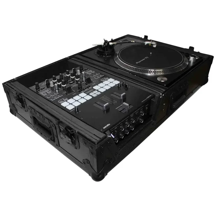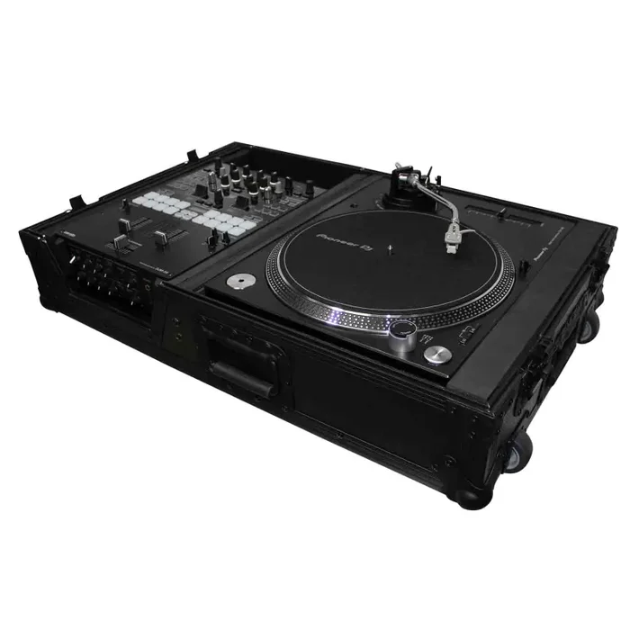The ProX XS-TMC1012WBL Single turntable single mixer coffin case is the case you been waiting for. If you only use one turntable and a mixer and are looking to lighten your load the XS-TMC1012WBL is the case for you. Fits any turntable (battle mode) and any 10 to 12-inch mixers. The case weighs 34 lbs. Made from ProX Signature Series Plywood. Your gear is more than protected and still looks sleek with your setup. Can be used as left-handed or right-handed DJs. The removable panel on the mixer section allows for mixer placement on the right or left side. It’s all about the options.