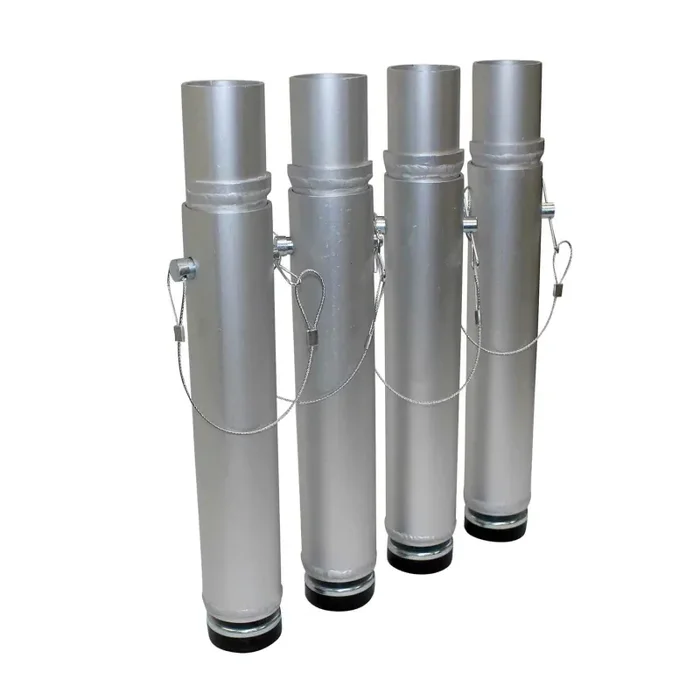 These adjustable legs offer good support and strength at an affordable price. Legs come standard with a 2-inch adjustable screw foot for fine leveling. Black rubber pad on the bottom so it will not mar or scratch any floor surface including gym floors. Stage Q portable stage decks in 4′ x 4′ and 4′ x 8′ use 4 legs for each section. Adjustable stage legs are most often used in outdoor applications on unlevel terrain to quickly level your portable stage. They are also used indoor or on level surfaces and give you the flexibility of having multiple heights while owning one just set of legs. Adjustable legs include an outer and an inner leg plus a pin and screw foot for adjusting. The inner leg that fits inside your leg socket is made from the same exact size pipe as our standard fixed height legs. The outer pipe is the pipe that slides up and down for adjusting and has holes every 2″ plus a 2″ screw foot for fine leveling.