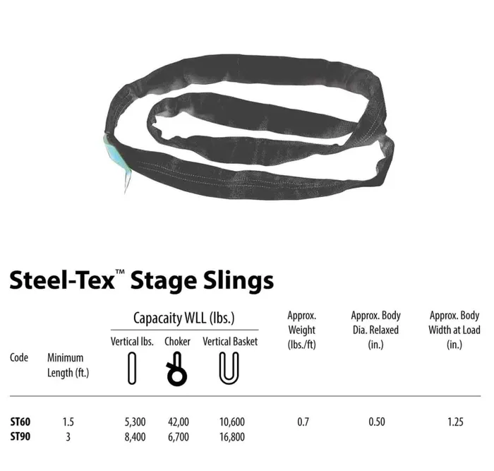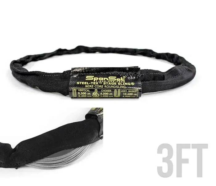 Steel-Tex round slings (commonly known as a GAC [Galvanized Aircraft Cable] slings) can be found at every entertainment venue and event where rigging is hung. Spanset Steel-Tex Slings feature a galvanized aircraft cable wound in an endless configuration for lifting strength, and the wire core is encased in a black double-wall polyester jacket.