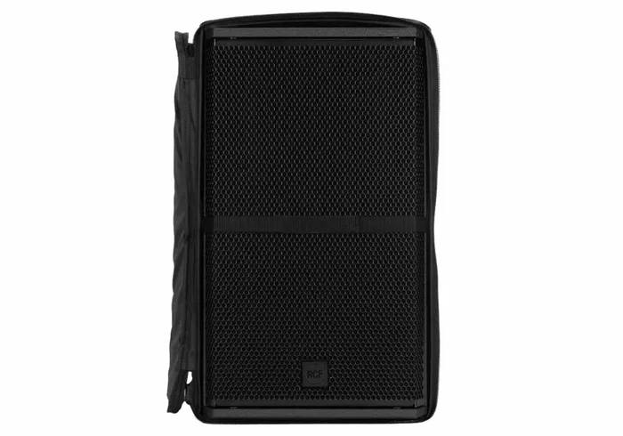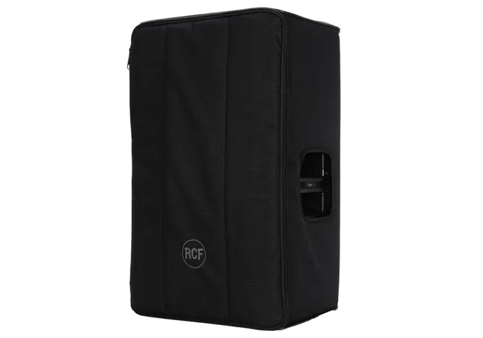 The RCF CVR NX 915 is a durable padded cover designed for the NX 915-A speaker, providing protection against scratches and impacts. Made from heavy-duty weatherproof polyester with foam rubber padding, it ensures long-lasting durability. The cover features zip openings with Velcro fasteners, allowing easy access to handles, the rear connection panel, and the pole mount cap. The front panel
