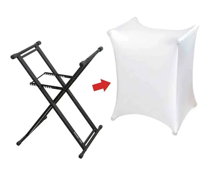 The Scrim King SS-XST01-W Keyboard X Stand Scrim White. for keyboards and DJ coffins. 2 Custom holes to feed wiring down. Stretch factor: Covers all levels from seated keyboardist to Standing DJ. Hide your X-Stand, hide your cables, and improve your look with the most trusted and BEST quality scrims in the industry One size fits all standard X-Stands, Scrims also give you the potential to offer up-lighting right below your X-Stand.