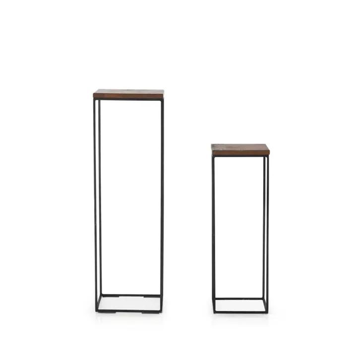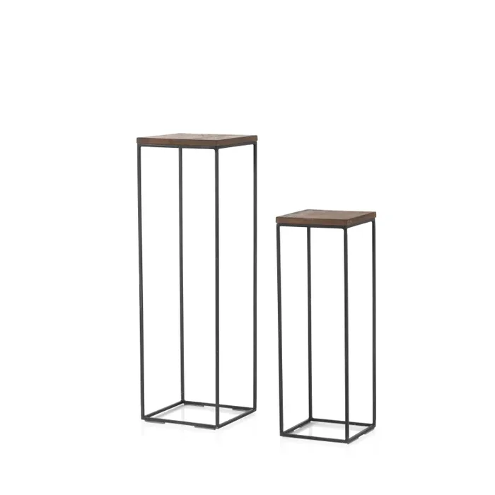Details: Thin metal pedestal with dark wood top. Part of a set of two pedestals (taller version rented separately).