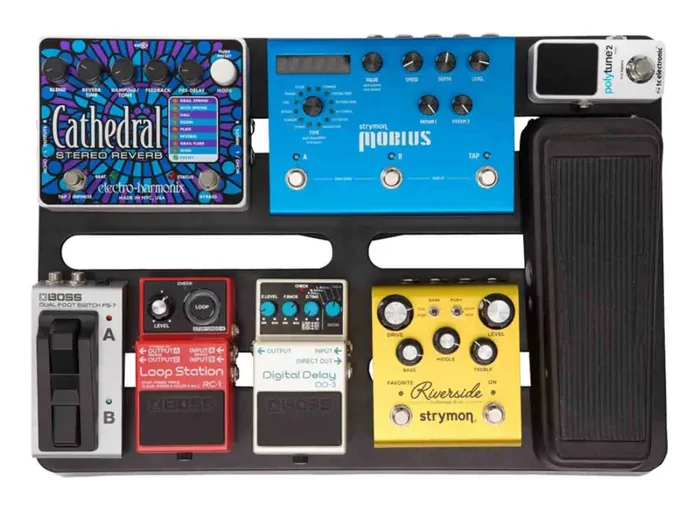 The SKB Cases 1SKB-PB1712 Injection Molded Non-Powered Pedal Board is constructed of lightweight, heavy-duty ABS and accommodates up to eight pedals. The frame size is 17.67″ x 12.37″. It also features a unique under-mounting surface that allows for convenient storage and transport of a variety of power supplies. Other standard features include molded-in hand grips for easy lifting, six zip ties for cable management, and 96″ of 3M brand low profile Dual-Lock for secure positioning of pedals.