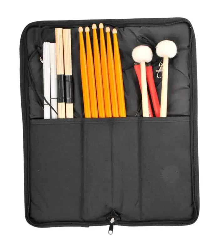 The SKB Cases 1SKB-SB100 Standard Stick Gig Bag includes three interior stick pockets, an external accessory pouch for a drum key or accessories with heavy-duty zippers. The 1SKB-SB100 includes two straps with stainless snap swivel hooks for secure mounting on the side of a floor tom and an adjustable shoulder strap.
