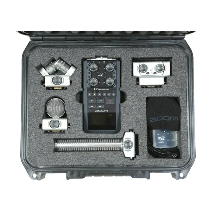 The SKB Cases 3i-1209-4-H6B iSeries is a Case for Zoom H6 Broadcast Recorder Kit and this military-standard waterproof hard case was specifically designed for the Zoom H6 recorders. The interior is custom-cut high-quality PE foam that includes space for the ultimate Zoom H6 recording setup. This includes pockets for the recorder, XYH-6 X/Y mic capsule, MSH-6 MS mic capsule, SGH-6 or SSH-6 Shotgun mic capsule, EXH-6 Dual XLR/TRS Combo capsule, windscreen, memory cards, cables, and additional accessories.