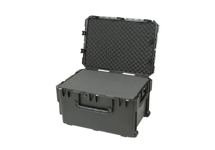 Transporting the case is possible with three snap-down, overmolded grip handles and one tow handle to use when rolling the case on the four in-line skate-style wheels. The padlock holes come with stainless steel protector clips and the cubed foam lets you customize the interior for your items.