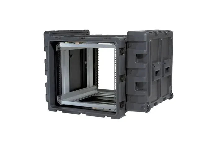 The rugged roto-molded shell ensures industry leading strength and impact resistance. The standard COTS (commercial off the shelf) case comes with a 2” deep front lid and a 5” deep rear lid to accommodate rack gear that is longer than 24”, and edge casters to allow convenient case transport. Molded-in stacking ribs and lugs are designed to stack with competitive manufacturers cases. Black powder coated stainless steel hardware are recessed for protection is standard as well as 8 comfort grip spring loaded lift handles which allow for easy movement. An automatic pressure relief valve is another standard feature along with gasket sealed lids that include convenient lid hangers to store your lids when your equipment is in operation. Coupling straps are included for securing the racks together when stacked.