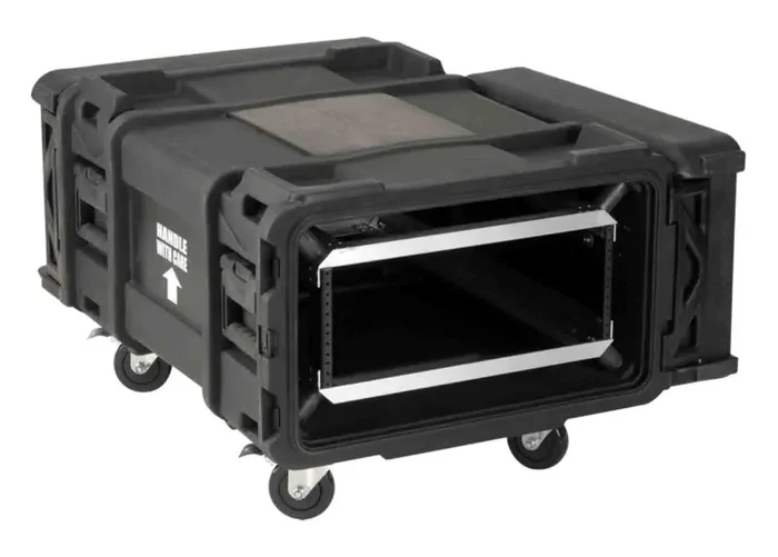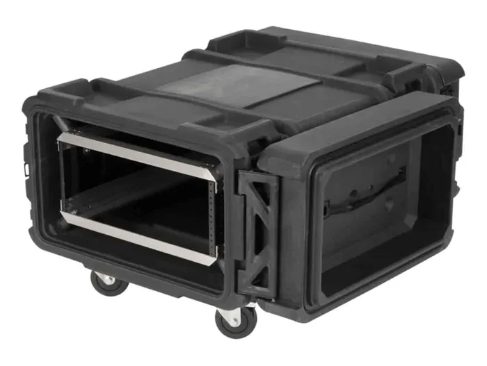 Both front and rear lids are designed to protrude into the base of the case approximately 1″ with a unique double wall structure that makes them incredibly rigid where this intersection occurs, providing MIL-SPEC sealing characteristics with significantly fewer latches than most competitive cases. This revolutionary design allows for rapid deployment in an up-right configuration, even when stacked — 3SKB Roto Shock Racks are the only shock racks in the marketplace today that will open front and back while stacked.