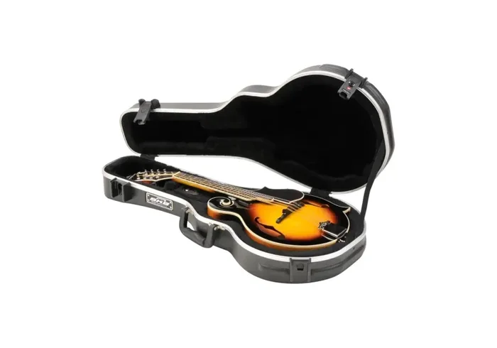 The SKB-80F Mandolin Case is crafted from durable ABS plastic and designed to fit the delicate florentine shape of the “F” style mandolin. It features a fitted interior with full neck support and Deluxe Plush protection on all sides for maximum safety. The case includes a fiberglass reinforced nylon trigger release latching system, bumper-protected valance, and injection-molded feet for added durability. A comfortable carrying handle ensures easy transport, while the rigid EPS foam interior keeps the mandolin secure. The case also offers an accessories compartment for additional storage.