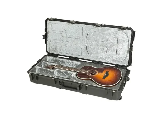 The SKB iSeries revolutionized the industry with the first INJECTION molded acoustic guitar case. The iSeries 4217-30 accommodates most Classical guitars. iSeries injection molded waterproof cases are constructed of ultra high-strength polypropylene copolymer resin and feature a gasketed, waterproof, submersible design that is resistant to corrosion and impact damage. Its continuous molded-in hinges, Trigger Latch System with TSA recognized and accepted locks, four reinforced locking loops for customer supplied locks, comfortable, snap-down rubber over-molded cushion grip handles, secure stacking, and automatic ambient pressure equalization valve (MIL-STD-648C) all contribute to its military grade design. The platinum plush interior provides total neck support and protection on all sides.