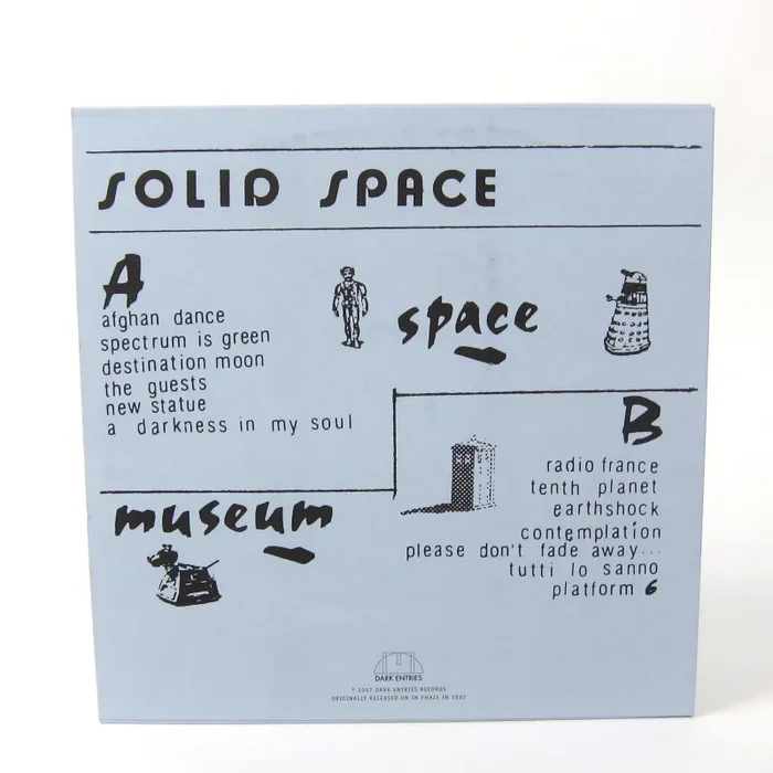 Lone album by Matthew Vosburgh and Dan Goldstein as Solid Space, released in 1982 when they were just 18 years old. Considered by Veronica Vasicka to be one of the best minimal wave records of all time, Space Museum is a singular work fusing dark acoustic guitar chords, atmospheric Casio MT-30 vamps and bossa nova drum machine rhythms (I put this on in my apartment and after the first couple bars of “Afghan Dance,” my bird starting singing “Hotline Bling,” LOL), executed with a certain playfulness that’s noticeably absent in most of these austere 80s postpunk records. At it’s highest points, it splits the difference between the cold freeze dramatics of The Cure’s goth trilogy and the provincial teenage dejection of Felt or The Smiths, but don’t fade away, it’s not all castrated misery here. Thoughts of the moon, the stars and a general longing for the outer limits pervade the record (many of the track titles are taken directly from Dr. Who serials and 1960s sci-fi shows), and the boys even play one for the dancefloor on “Radio France.” Says Vosburgh: “Solid Space involved me getting on a bus with a bunch of equipment and going over to Dan’s house for the afternoon, one reason we always favoured light battery-powered gear.” While the duo’s naïveté is directly responsible for the brilliance of these recordings, Space Museum can actually get a little grating at times (by the time the shriek-filled closing track rolled around, GF was begging me to turn it off) but that’s part of its charm, here in all its original raw and overlooked glory with two bonus tracks from the band’s archive (“Platform 6,” “Tutti Lo Sanno”). Check out “Destination Moon,” “A Darkness In My Soul,” “Afghan Dance” (spiritual sister to Antena‘s “Achilles”), “Please Don’t Fade Away,” “Tenth Planet” and “Earthshock.” Originally released on cassette in 1982 and only available on vinyl via a number of shoddy bootlegs, west coast wave saviors Dark Entries come through with the first-ever legit vinyl pressing – and it sounds incredible. Includes printed insert with full album credits and lyrics plus a replica postcard featuring the original ad for the cassette. Recommended.