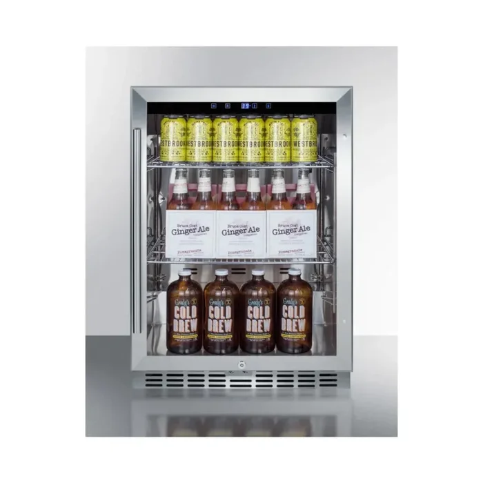 The 24-inch SUMMIT Outdoor Beverage Center is commercially approved which is ETL-S listed to NSF-7 standards. The weatherproof design features 304-grade stainless steel wrapped cabinet and sealed back to help keep the unit safe from the elements, with an integrated ground fault circuit interrupter for added protection. The stainless steel trimmed door features double pane tempered glass and a pro-style handle. The door is user-reversible for added flexibility and includes a factory-installed lock. The front-breathing design allows it to be built-in under counters, while the fully finished cabinet is also capable of freestanding use.