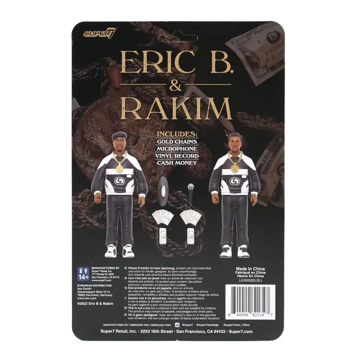 “Every generation has its ground-breaking innovators, and Eric B. & Rakim blew the lid off of the perceived limitations of Hip-Hop as a genre and art form. This articulated 3.75” scale ReAction Figure 2-pack of Eric B. & Rakim features designs inspired by the cover art from their debut studio album Paid in Full and comes with gold chains, microphone, vinyl record, and cash money accessories. Eric B. & Rakim are considered to be one of the greatest Hip-Hop duos of all-time and their ReAction Figure 2-pack will be a similarly legendary addition to your collection!” – Super7