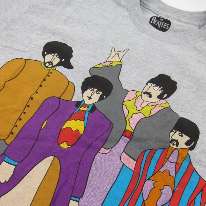 John, Paul, George and Ringo in classic psychedelic cartoon style as seen in the 1969 Yellow Submarine film. Printed on heather grey, cotton blend tees.