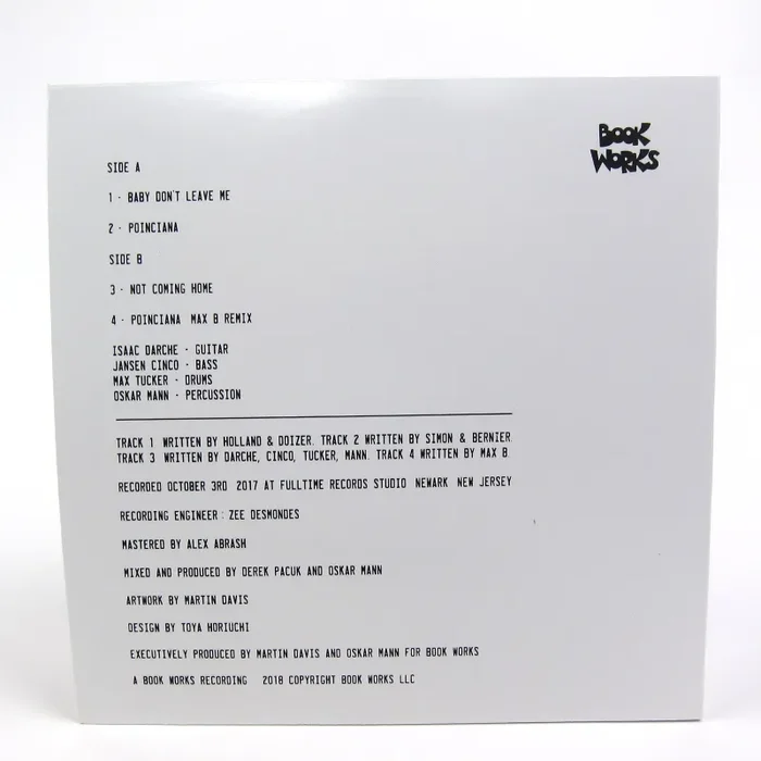 We first became aware of Martin Davis and Oskar Mann’s Book Works after spotting one of their slick t-shirts with tasteful jazz-inspired graphics. After digging a little deeper, it turns out jazz is woven into the fabric (heh) of everything they do. And now they’re doubling down on their love of jazz by expanding their operations to include original music and limited-run vinyl editions. The first of these, the Book Works Trio EP, collects a handful of tunes recorded by Oskar with classmates from The New School’s jazz program and Manhattan School of Music. All three tracks sport cool, laidback grooves landing somewhere on the spectrum between jazz and funk, anchored by Max Tucker’s drum kit and Jansen Cinco’s bass, with Isaac Darche’s masterful high-register guitar flourishes sealing the deal. The real highlight here is the breezy slow-disco rendition of cubano-jazz standard “Poinciana,” featuring some of Darche’s best playing on the EP, and Oskar’s latin-inspired polyrhythms really take the tune to another level, primed for sweltering hot August nights standing out on Avenue B. The flipside sports a remix of the track by Max B (not that Max B, but free that Max B!), who reinterprets it via the Primo school of hip-hop drums, retaining the original’s summery guitar inflections and adding a sprinkle of Dilla sirens for good measure. Cut nice and loud at 45RPM, housed in screenprinted jacket featuring original artwork by Martin Davis and additional design by Toya Horiuchi. Recommended.
