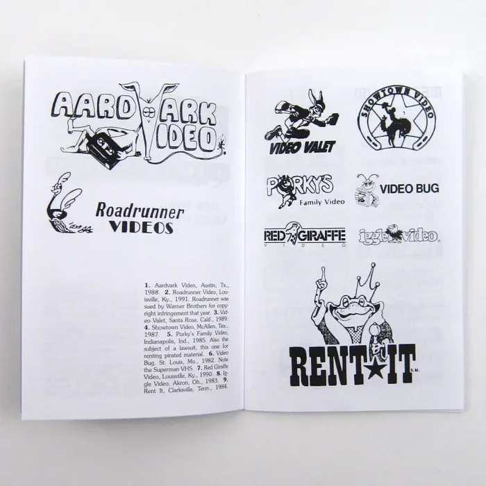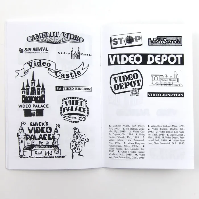 Before home video, if you wanted to see Star Wars, you had to wait for it to pop up on TV. In the era before the studios discovered the value of the direct-to-consumer video market, Video rental stores were an unavoidable part of the retail landscape. Dozens of mom-and-pop shops thrived in every city, town, remote ski lodge, sketchy resort boardwalk, and beyond. These small businesses codified a surprisingly unified visual identity that includes unique text treatments, outsider-art mascots, and subliminal bits of local history baked into each logotype. Most of these businesses existed pre-internet and never operated websites, causing much of this material to be lost to memory until now. This zine was assembled by Andy Sturdevant, primarily from local newspaper advertisements. It includes over 100 logos spanning the entire United States, keep an eye out for your old favorites. 28 pages, black and white laser print, edition of 100.