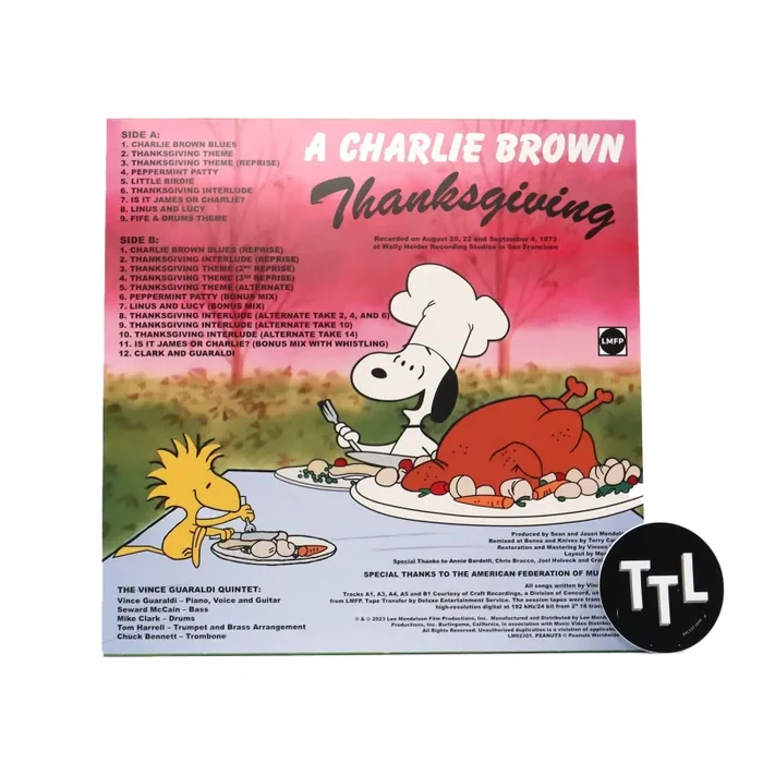 “We are proud to announce, for the first time ever, the release of the complete soundtrack to ‘A Charlie Brown Thanksgiving.’ Just in time for the 50th anniversary of the celebrated animated holiday television special, written and created by Charles Schulz, directed by Bill Melendez and Phil Roman and produced by Melendez and Lee Mendelson, this is the complete Vince Guaraldi score along with never-before-heard bonus material. Newly re-discovered in our vaults, the original recording sessions for Vince Guaraldi’s beloved soundtrack have been remixed and remastered for audiophiles and Peanuts® fans everywhere. Includes many previously unreleased tracks, several never heard since the Vince Guaraldi Quintet laid them down for the recording session in 1973. All remastered from the original 2′ 16 track source tapes. This soundtrack from the 1973 holiday classic includes Guaraldi hits from the original sources like the funky brass filled ‘Linus and Lucy’, ‘Thanksgiving Theme’, and the soulful ‘Little Birdie’.” – Lee Mendelson Film Productions