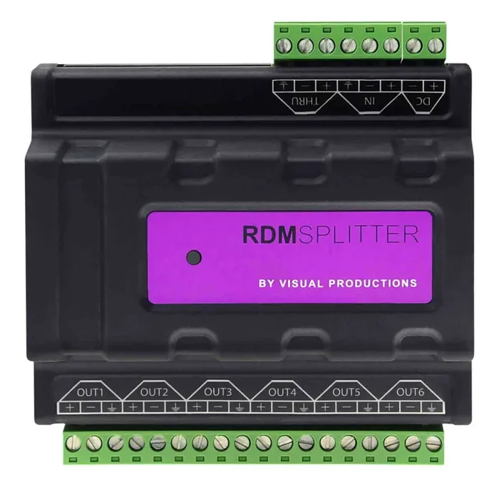 The Visual Production RDM Splitter (T) is a Rail Mounted DMX+RDM Splitter/Booster. The RdmSplitter is an optically isolated splitter/booster for DMX and RDM networks.