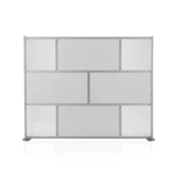 Details: Silver partition with opaque acrylic windows and white board panels.