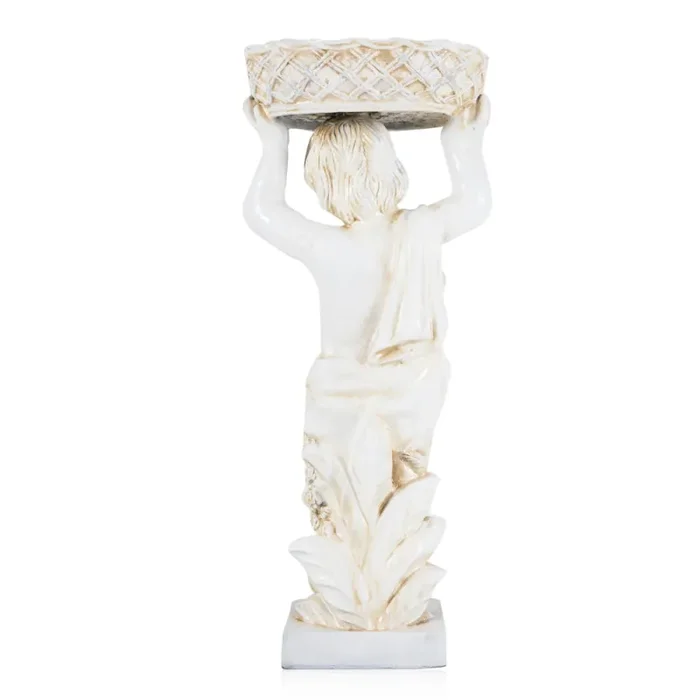 Details: White lawn ornament of a cherub holding a basket