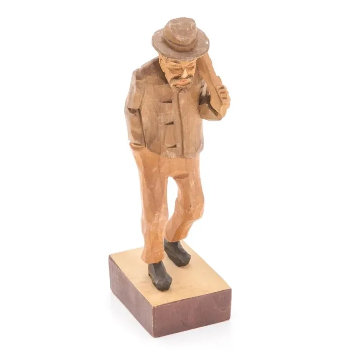 Details: Primitive carved wood sculpture of a man holding a sack over his shoulder