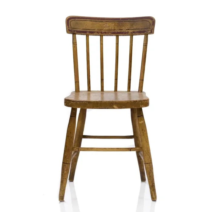 Details: Light brown weathered wood side chair with small worn red and black stripes