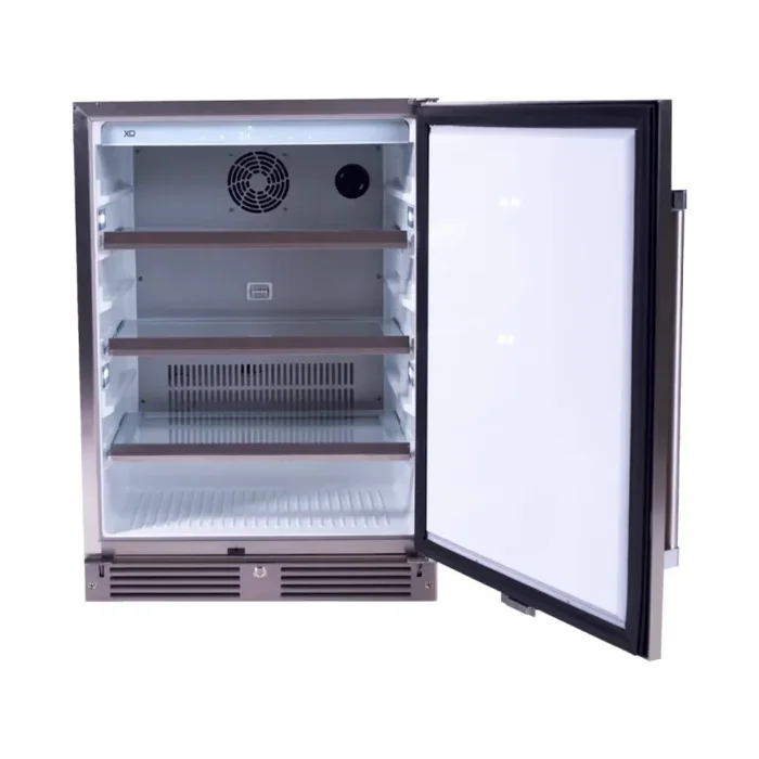XO XOU24ORSL 24 Inch Outdoor Refrigerator with Glass Shelves, Tri-Color LED Interior Lighting, Secure Door Lock, Digital Temperature Controls, Eco/Sabbath Mode, Wine Cradle Included and Handle Options Included: Left Hinge