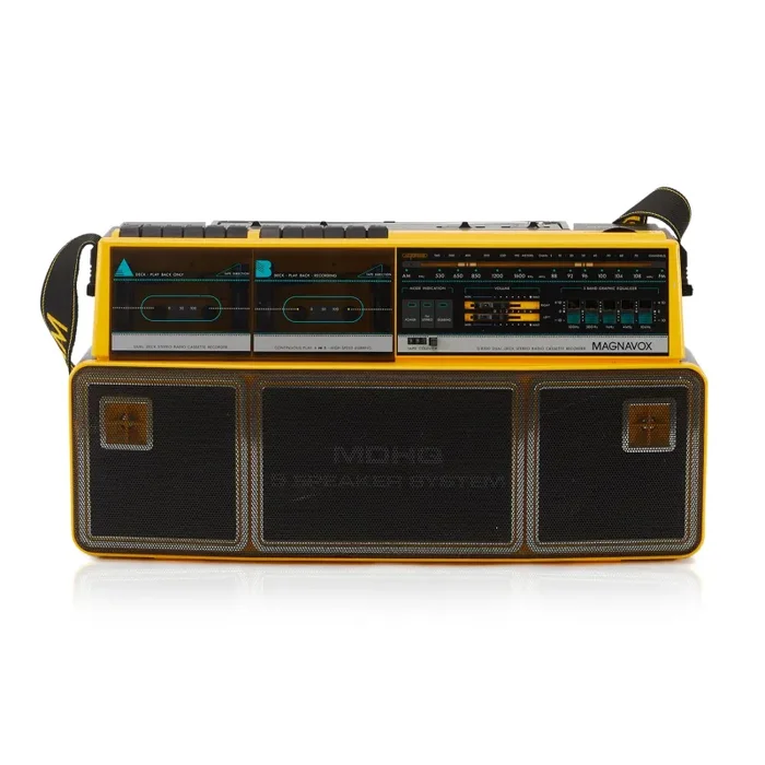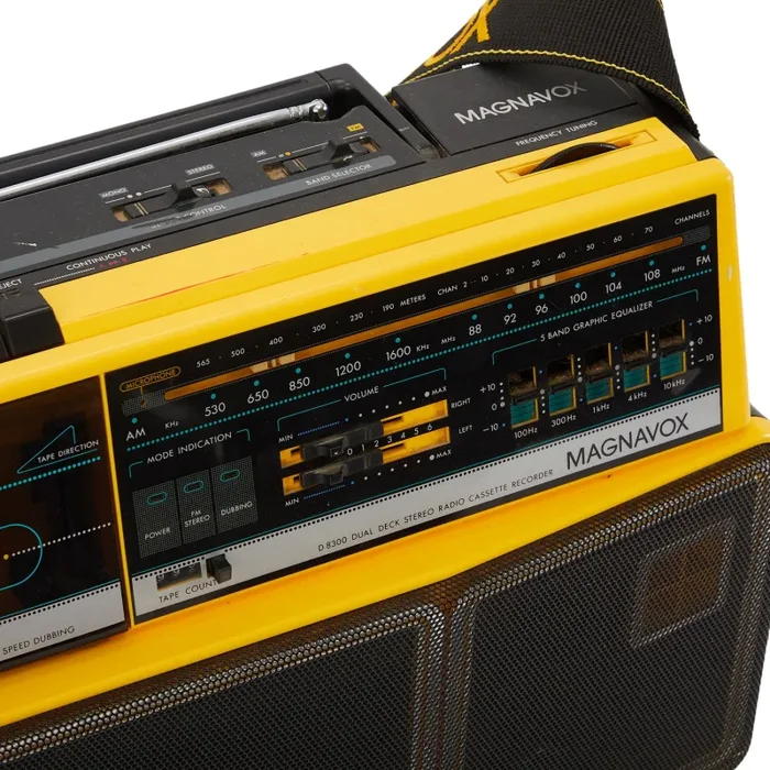 Details: Yellow and black Magnavox boombox with tape player and strap