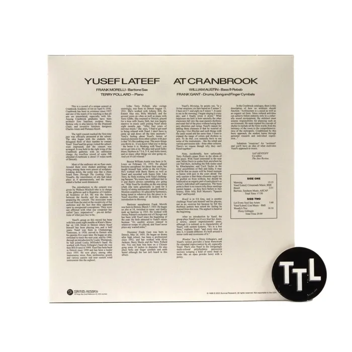 “Ceaseless seeker Yusef Lateef continually sought to push the boundaries of jazz, striving to make connections across continents and to capture the essence of devotional expression long before the term ‘world music’ was coined. Recorded at the Cranbrook Academy of Art in 1958, Lateef At Cranbrook is a stunning set of instrumentals reaching into the Middle East and the Horn of Africa, the unusual line-up including Frank Morelli on baritone sax, William Austin on rabab, and Terry Polland on piano, with Lateef commanding the proceedings on tenor sax. An exceptional and emotive musical journey.” – Survival Research