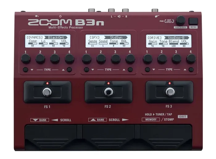 The B3n’s simple layout and controls make for faster and more intuitive editing. Its three independent LCD screens display your entire effects chain at a glance, and its tactile knobs and switches give you effortless control over adding, editing, deleting, or changing the order of effects.